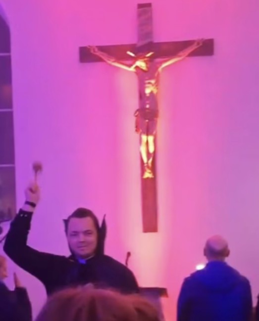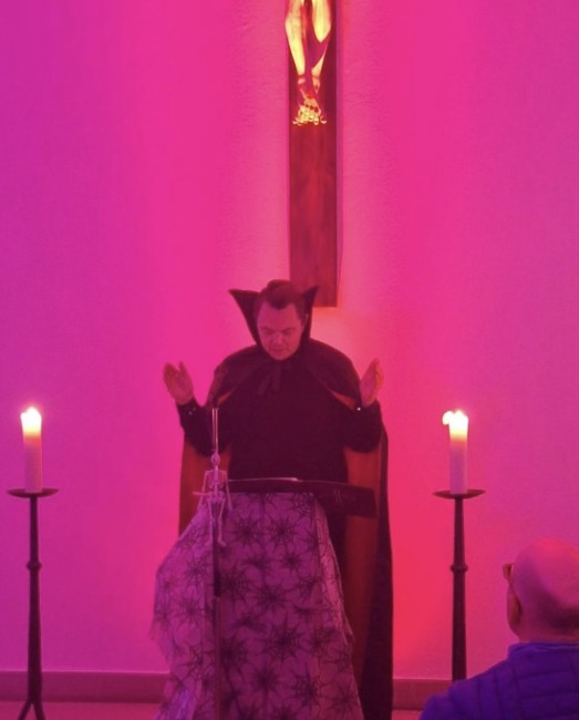 Pfarrvikar Michael Korell als Dracula verkleidet beim Halloween-Gottesdienst